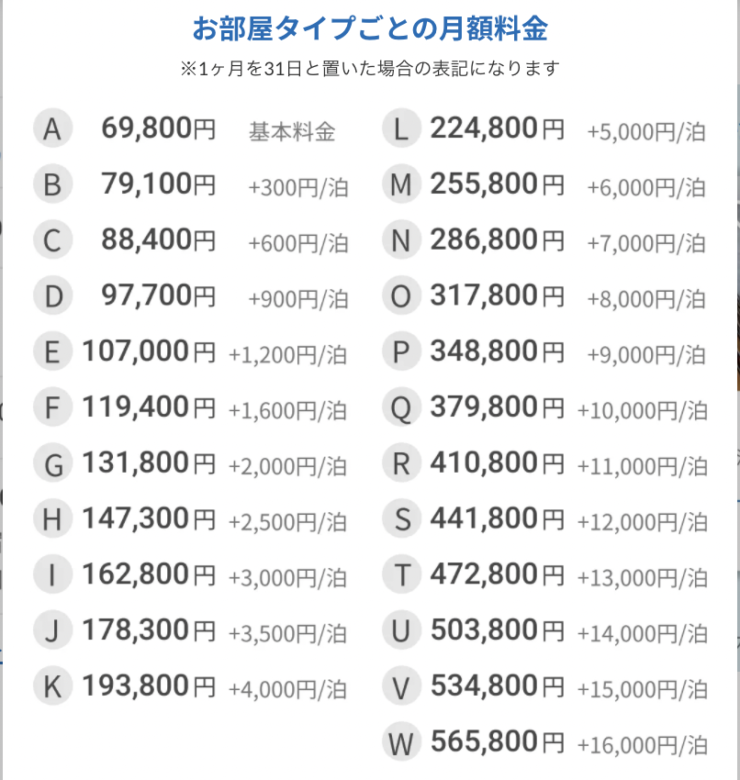 初回登録料が9,800円かかり、最短2週間単位でホテルを予約するのが特徴です。基本料金は月額69,800円。そのほかに、管理費が約9,900円(330円/日x日数)がかかります。